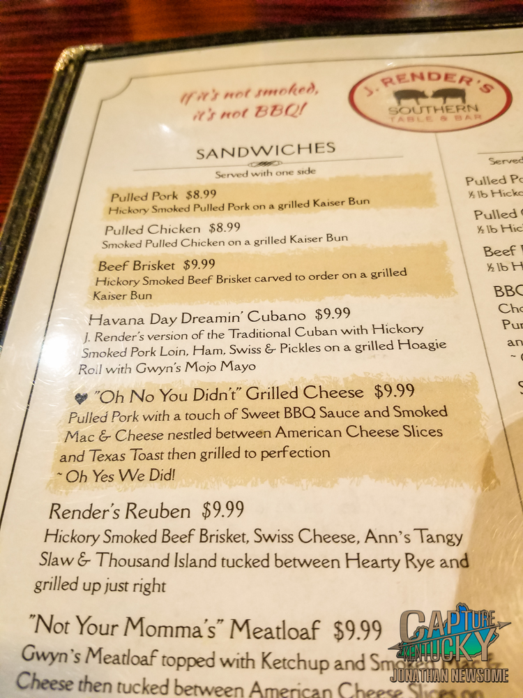 We were told about J Render’s, which opened in May of 2016. J Render’s Southern Table and Bar, located at 3191 Beaumont Center Circle in Lexington, KY has a variety of dishes that will make you feel right at home. Well, if you’re from the south at least. J Render’s serves up a Texas-style BBQ, which has a vinegar-based sauce. The red sauce is used primarily on the brisket, pork and even the Purnell’s KY Proud Smoked Sausage. The sauce comes in a couple of different tastes. While the Alabama-style white sauce is used mainly on the chicken. The menu has items such as appetizers, salads, smoked brisket, smoked pork, smoked chicken, smoked sausage, BBQ sandwiches, meatloaf, buttermilk