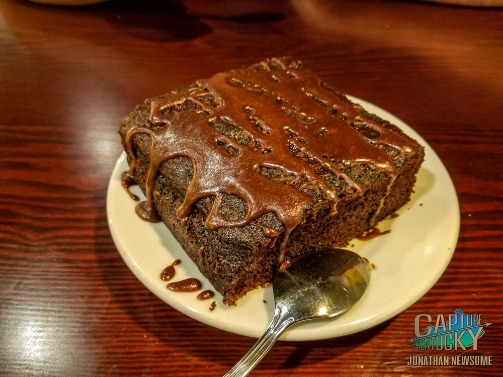 All that is well and good, but the reason you’ll want to visit J Render’s is a sandwich born in the food truck. One that has so much flavor, you’ll be hard-pressed to sit still and eat it. That sandwich is known as the “Oh No You Didn’t” grilled cheese. This sandwich has their pulled pork, topped with a touch of red sweet BBQ sauce, their smokey mac & cheese (which includes chipotle bacon), piled between two slices of American cheese, two pieces of texas toast and grilled to absolute perfection. I had the seasoned fries with my sandwich, which were delightful, and we finished off our meal with a GIGANTIC slice of their Maker’s Mark chocolate cake. That item is a piece of moist chocolate cake drizzled with a warm Maker’s Mark Bourbon & Cola Glaze…OMG!